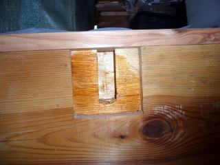 | 階段の位置をずらした為、開いたホゾ穴をリフォームした棟梁の技術により、埋めました。 | |
