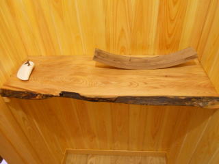 便座の反対側の棚板には、当初壁と同じ桧の羽目板を使用する予定でしたが、味気ないということで施主さんに当社の無垢板を選んでもらい、屋久杉の端材を取り付けました。 |