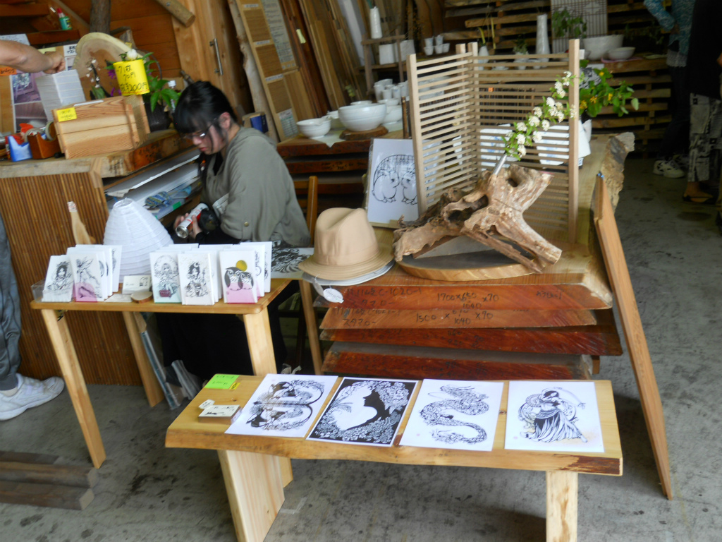 例年通りの松原先生の陶器コーナーです。後ろに組子の中障子がありますが、それから障子紙を取り外したものが非常に盛況で、多く売れました。 |